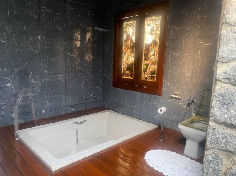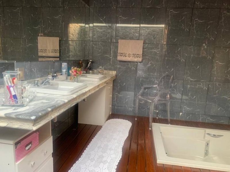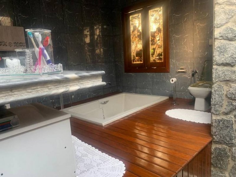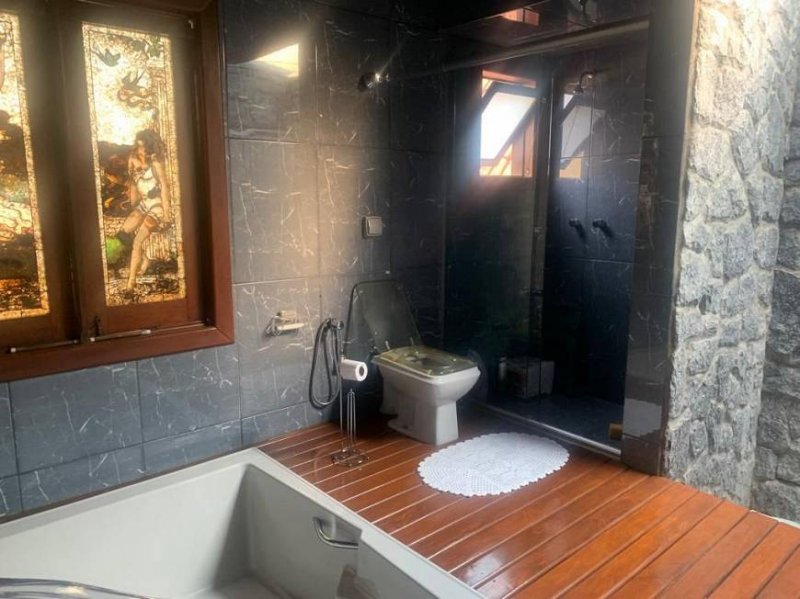 Casa com três quartos, um banho social, uma sala de estar com lareira, uma sala de TV, 1 sala de jantar, escritório, lavabo, Cozinha planejada, despensa, Jardim de inverno, Cozinha externa, Sala de jantar de apoio a piscina, Piscina com ducha e quiosque, Lavanderia, Banheiro social, Garagem para 02 carros.