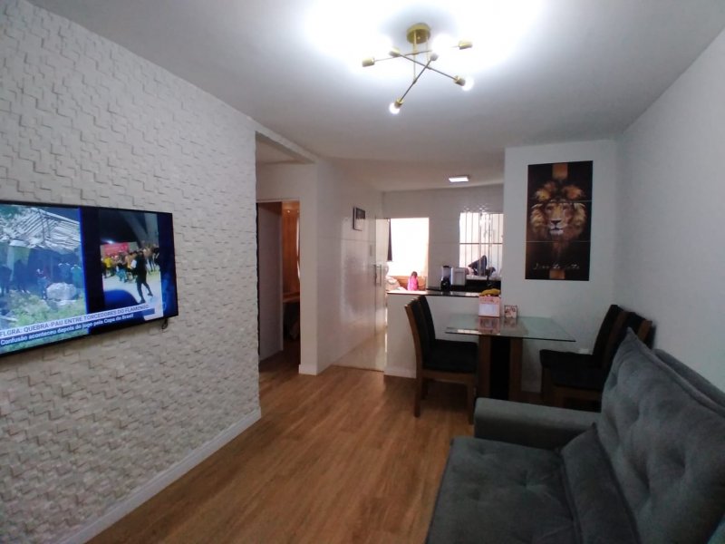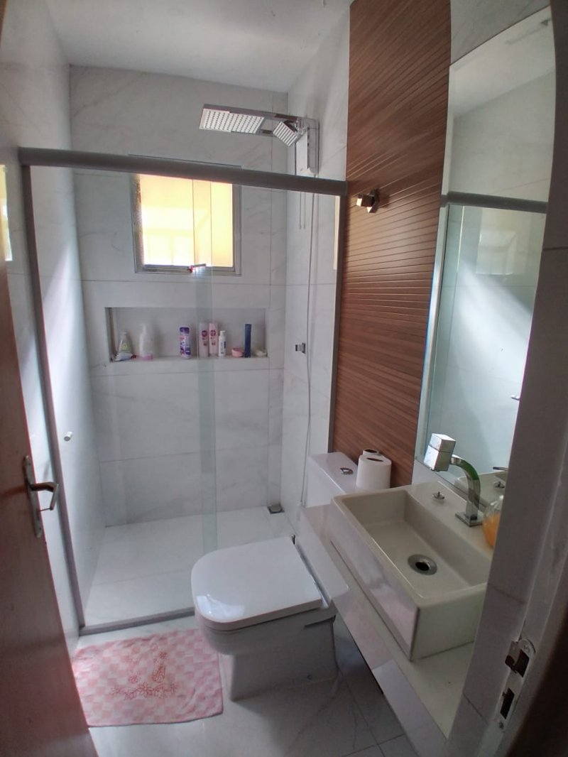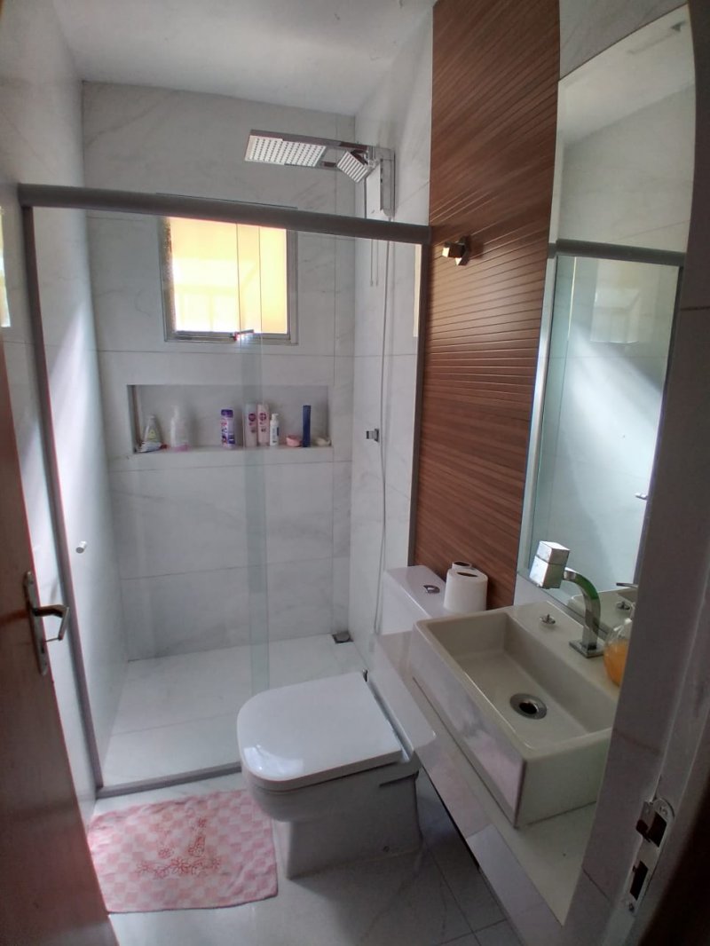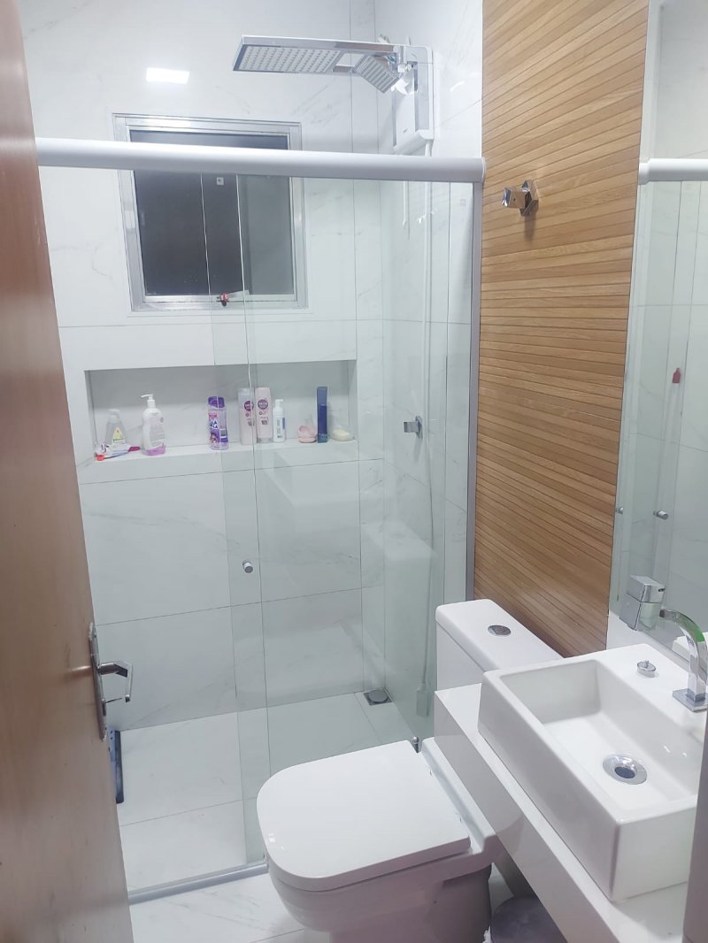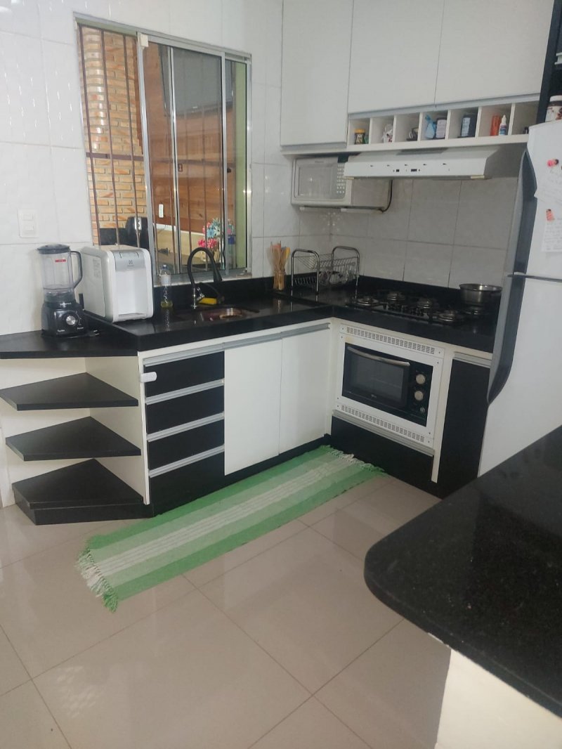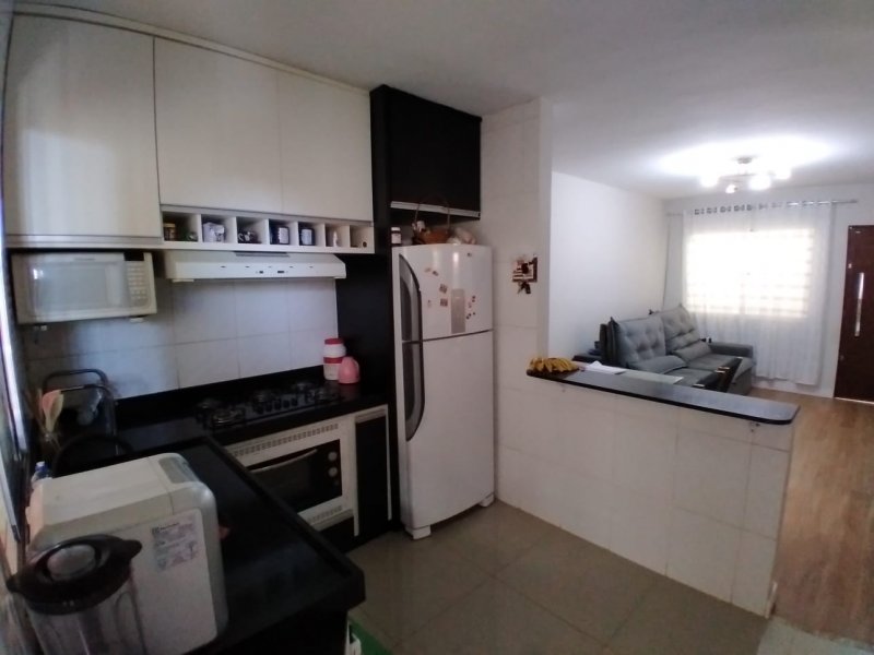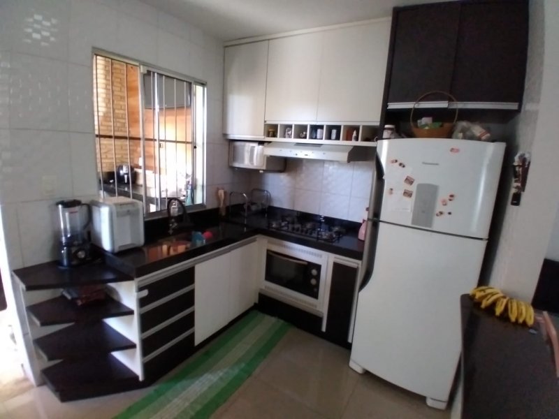 Casa 2 quartos, sala, banho social, cozinha americana com bancada em granito e área privativa com espaço gourmet e área de serviço. Uma vaga de garagem.