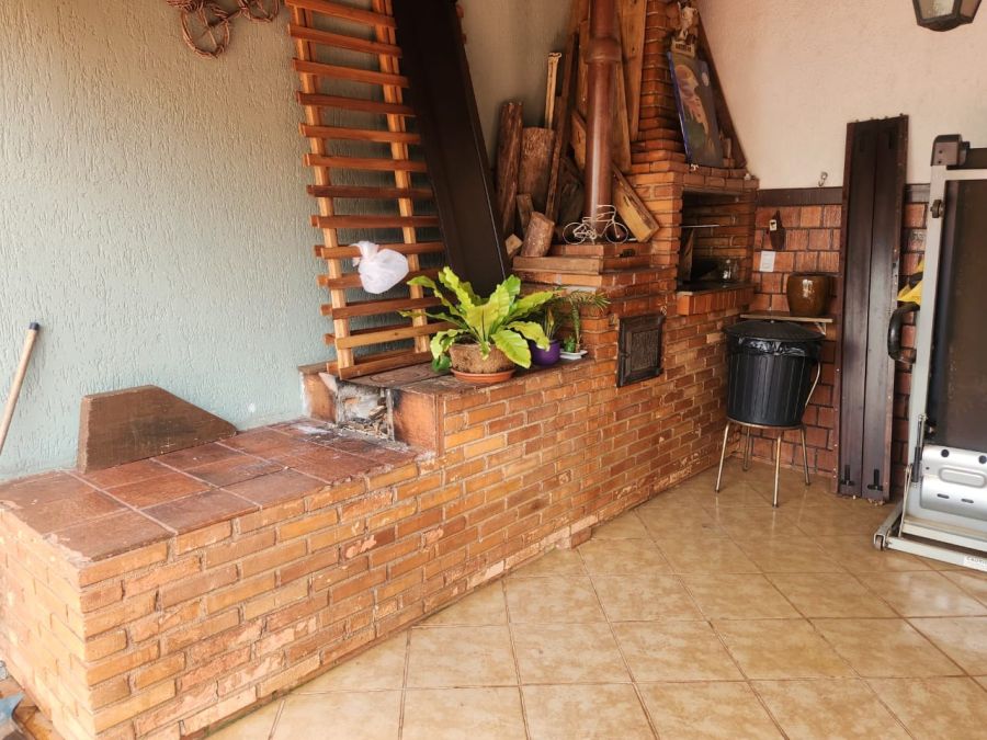 Espaço Gourmet externo com fogão e lenha e churrasqueira.