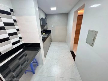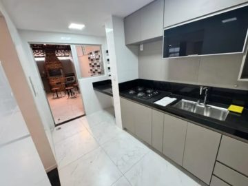 Cozinha: com armários e bancada em granito, dando acesso à área de serviço e área privativa.