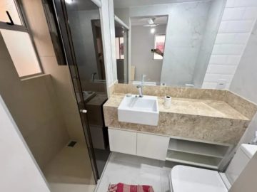Banheiro social: bancada em granito, cuba de embutir e box blindex.